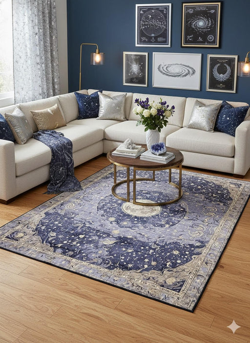 5' x 8' Navy Blue Gold Light Gray Celestial Pattern Vintage Rectangular Area Rug Product Details Our Blend – Super-Soft Cloud Flannel Material P...