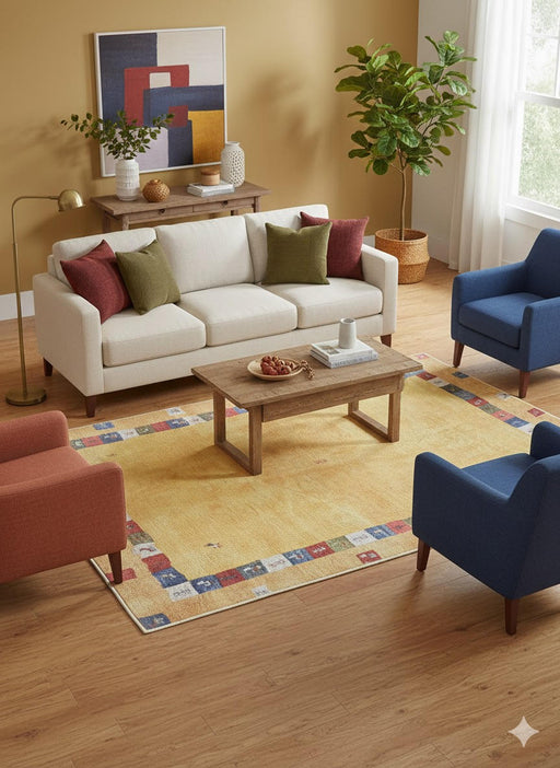 5' x 8' Mustard Yellow Multicolor Geometric Border Modern Area Rug Product Details Our Blend – Super-Soft Cloud Flannel Material Power Loomed; P...