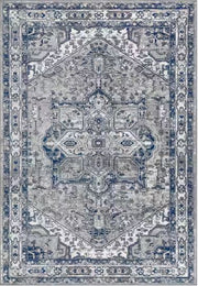 - Gray base is accented with navy and ivory in this classic Persian design