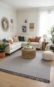 This Textured Border Stripe Area Rug from Hearth & Hand™ with Magnolia brings an artful appeal to your space while simultaneously making your home a bit more comfy. Showcasing an allover textured pattern featuring a subtle multiple stripe-like design, this indoor woven rug helps you maintain a clean floor while blending easily with your existing decor. The indoor rug with added tassels also features a flat-pile construction, making it a highly versatile accent piece that's easy to place in and around your living room or entryway. Simply toss it on the floor and liven up the area during traditional family dinners or fun gatherings with friends.