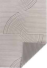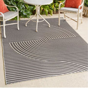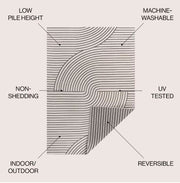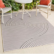 Our modern geometric rug is inspired by mid-century Scandinavian style. It's made from durable polypropylene fibers woven into a reversible curved stripe pattern. Use this stylish geometric rug outdoors, or in the bedroom, living room or dining room.
